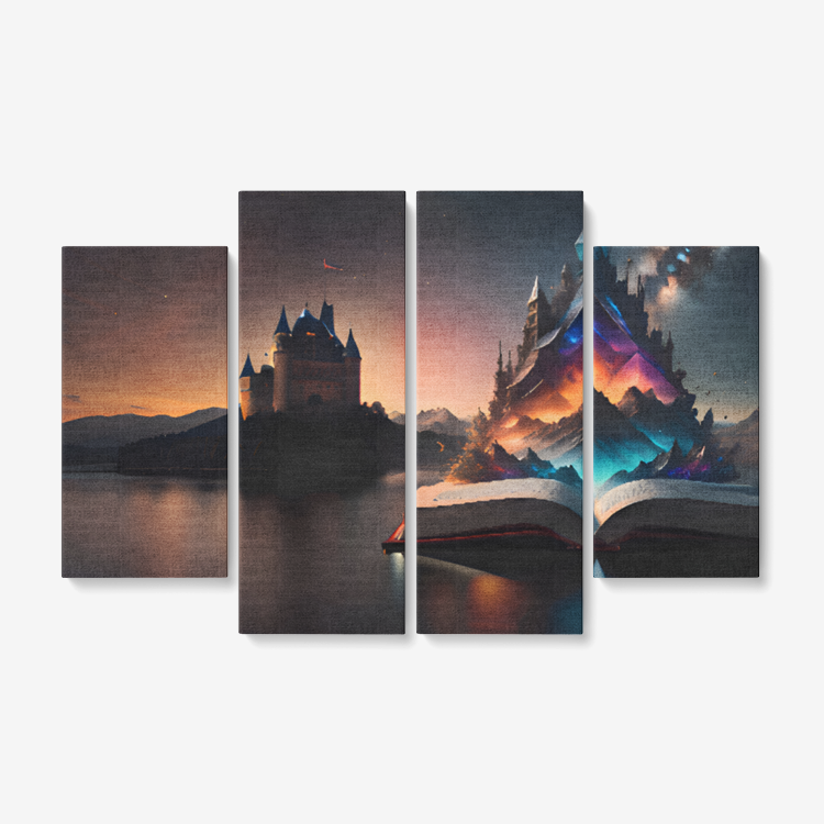 Step into the realm of imagination with our 'Epic Tales: Reflected Castle Legends Ensemble.' This captivating 4-piece canvas wall art tells a story of mythical proportions as a majestic castle unfolds both in the background and emerges from the pages of a reflective book, overlooking serene waters. Each piece intricately weaves the threads of legendary tales, creating a harmonious ensemble that transports you to a world where epic stories come to life. Let the enchanting combination of reflective beauty and legendary imagery grace your space, inviting you to embark on an epic journey every time you gaze upon this unique ensemble.